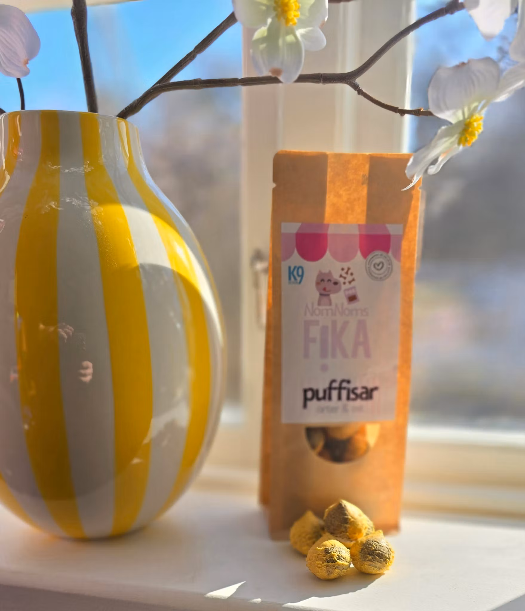 NomNoms Fika är en serie med härliga kex i fyra smaker, bakade för att kännas både lyxiga och roliga – som en riktig fika, fast för hundar 🐶💛