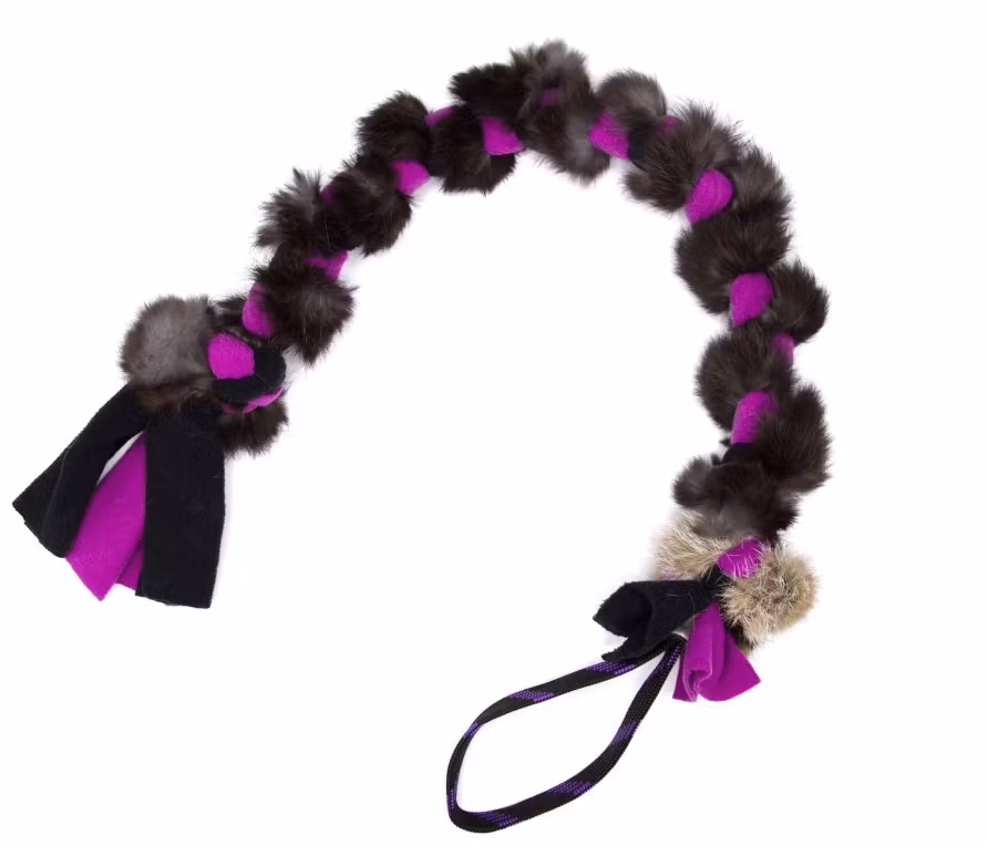 Underbar fleeceleksak med kaninpäls. Den blir snabbt en favorit och hundarna fullkomligen älskar den. Handtaget är klätt i softshell och blir på det viset mycket mjukt att hålla i för hundägaren. Remmen sys med i princip hela leksaken och gör det på det viset väldigt stark.